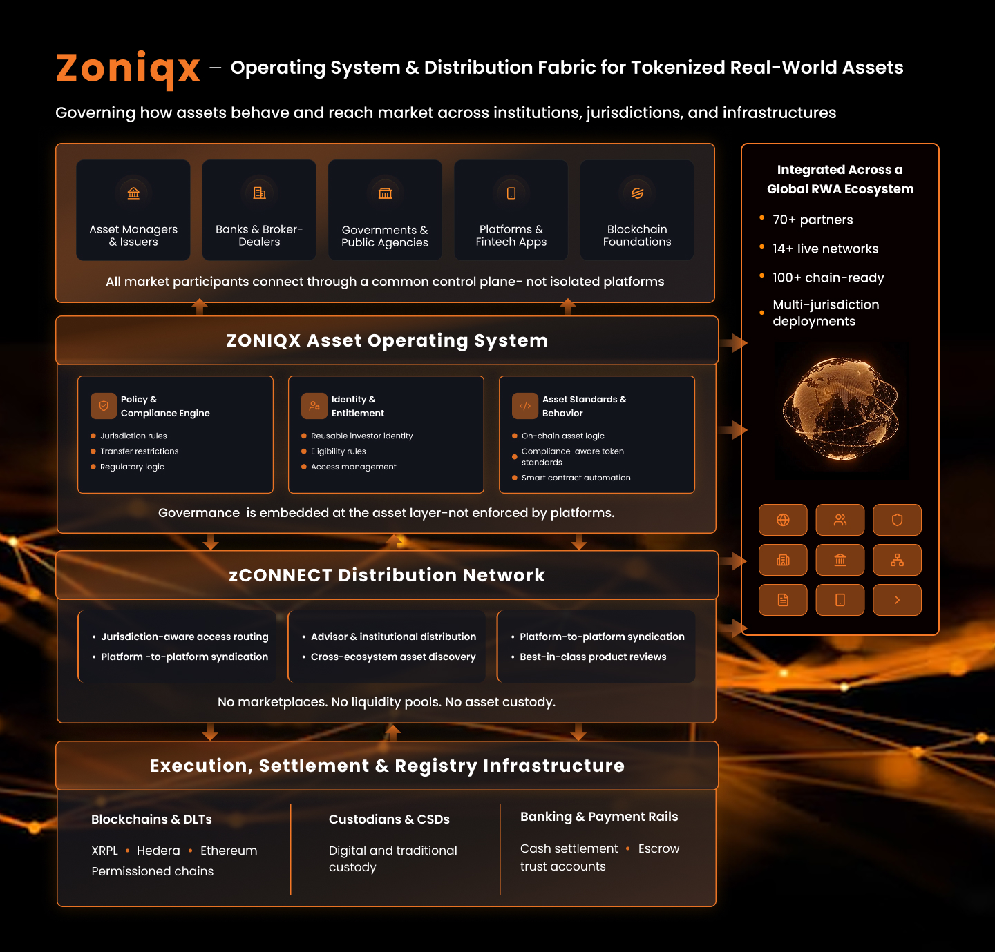 What does not exist is a neutral operating layer that governs how assets behave and how they reach markets once tokenized.