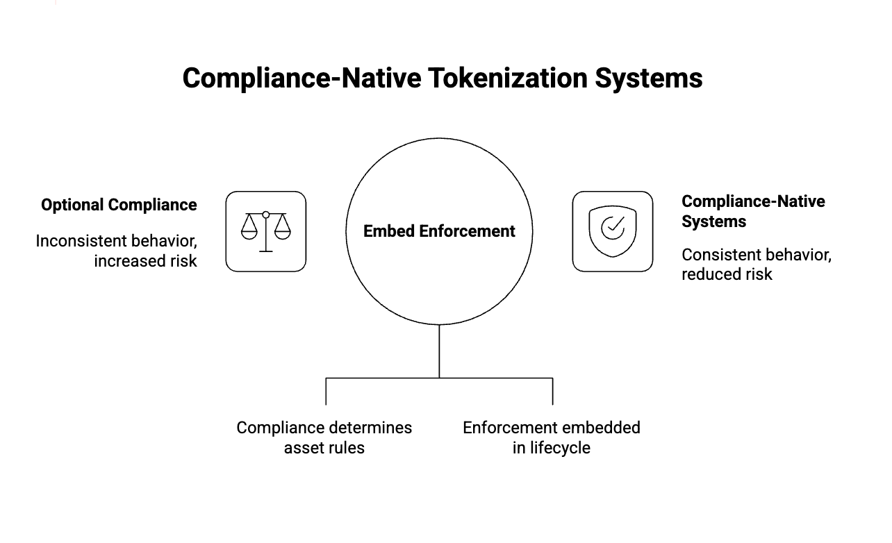 In contrast, compliance-native systems embed enforcement directly into the asset lifecycle. The asset behaves consistently regardless of where it is issued, traded, or settled because the rules governing it are inseparable from the asset itself.