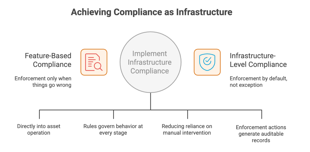 Compliance as infrastructure means that regulatory logic is embedded directly into the operation of an asset, rather than applied externally through platforms, processes, or manual controls.